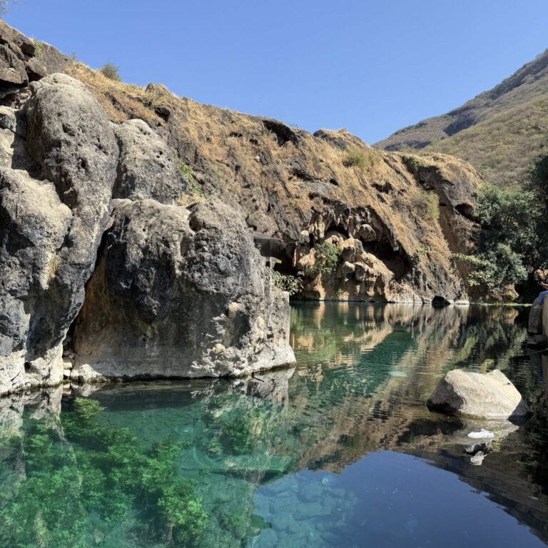 You swim the final section of Wadi Shab, clutching a dry bag above your head, until you squeeze through a hidden cave entrance and emerge into a cathedral-like chamber where a waterfall pours into a pool of extraordinary turquoise water. The whole experience takes three to four hours return. Go on a weekday if possible — Wadi Shab is popular, and the magic is best when you are not sharing it with a crowd.