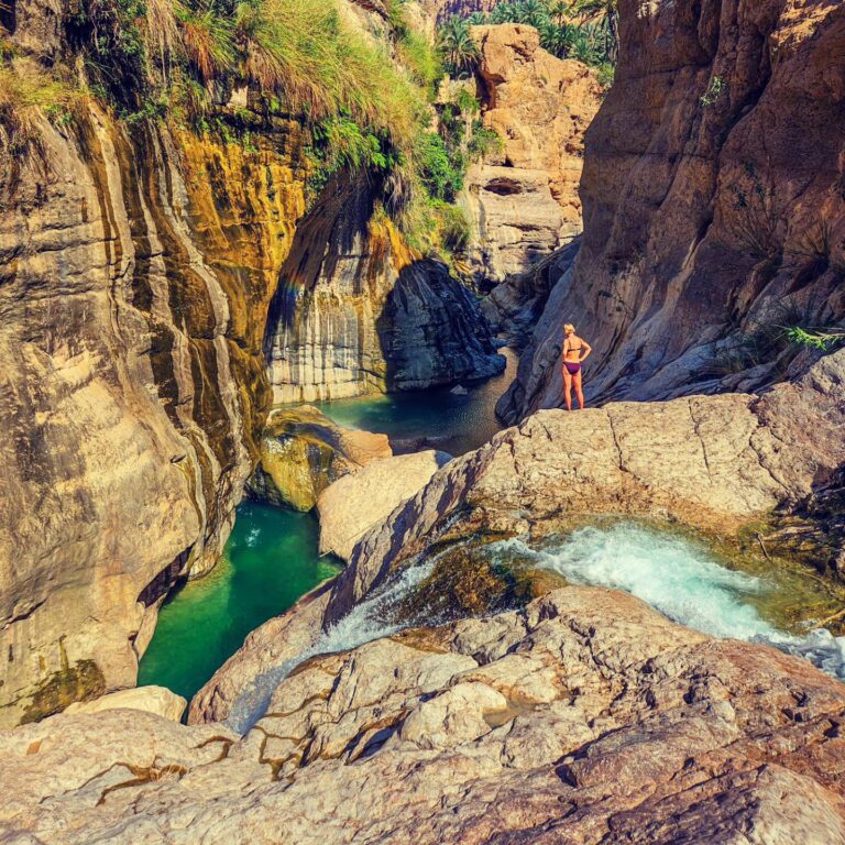 If Jebel Shams is about height, Wadi Shab is about depth — in every sense. Located between Muscat and Sur on Oman's Eastern Hajar coast, this emerald gorge is one of those places that genuinely looks too beautiful to be real. The hike begins with a short boat crossing (less than five minutes, a few rials) and then winds through a wide, palm-fringed wadi before narrowing dramatically into slot-canyon territory. The walls close in, the air cools, and then suddenly the path forces you into the water.