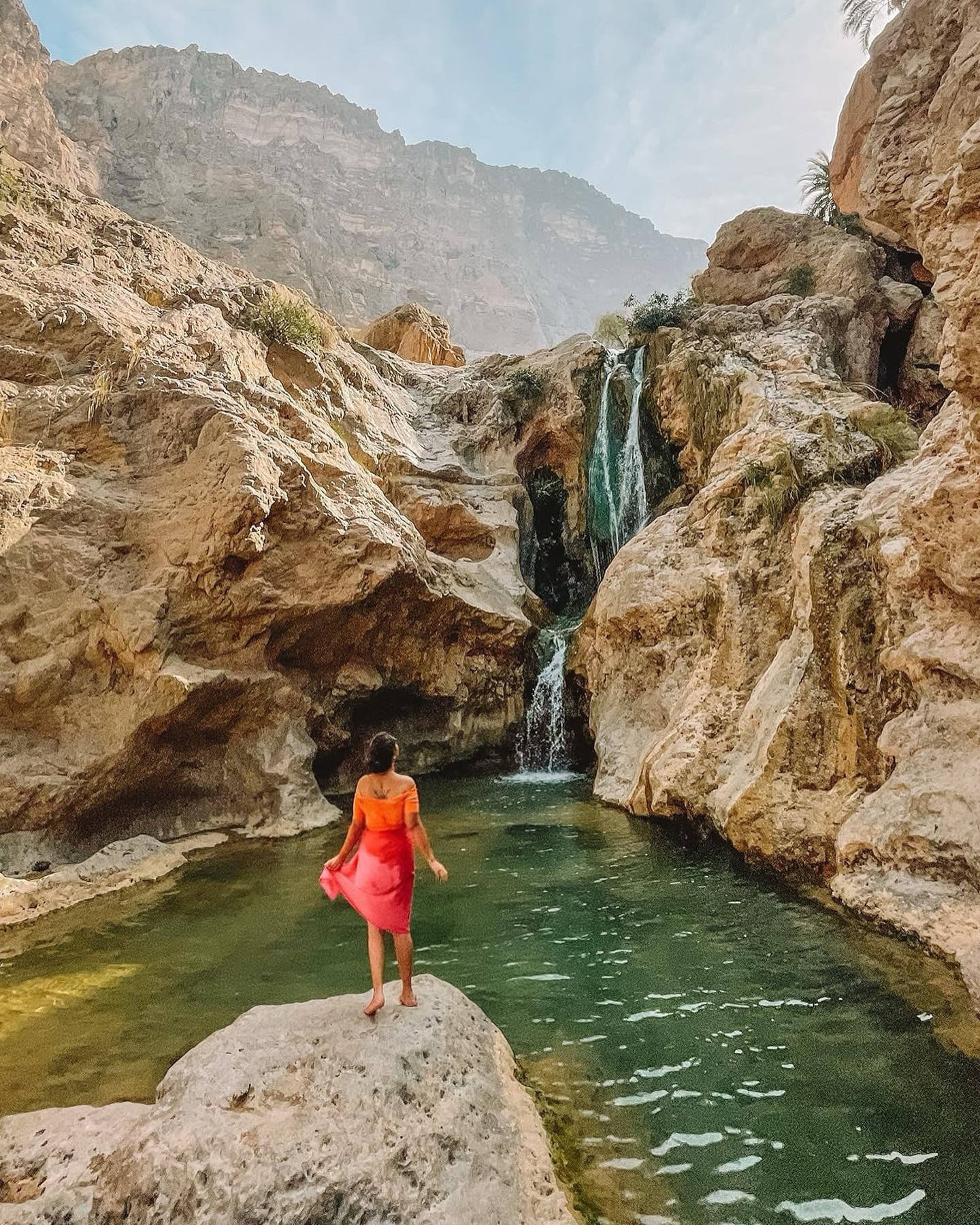 The journey through the wadi takes families past terraced date palms, through knee-deep pools of refreshingly cool water, and alongside towering canyon walls that provide natural shade. The ultimate reward awaits at the end: a hidden waterfall inside a cave where adventurous swimmers can explore the grotto's mystical blue-lit interior.